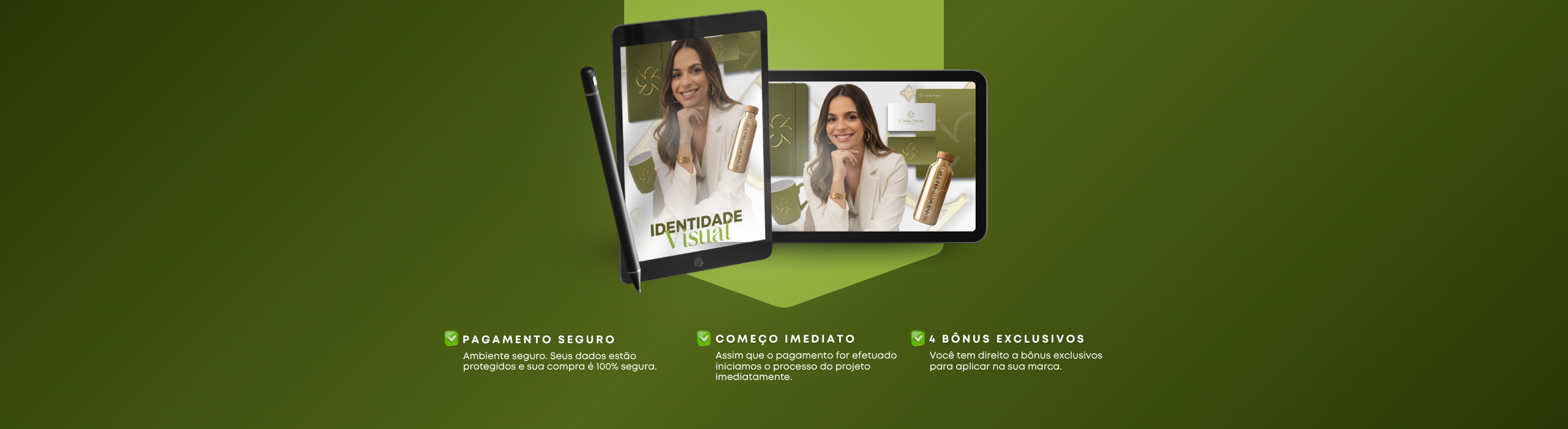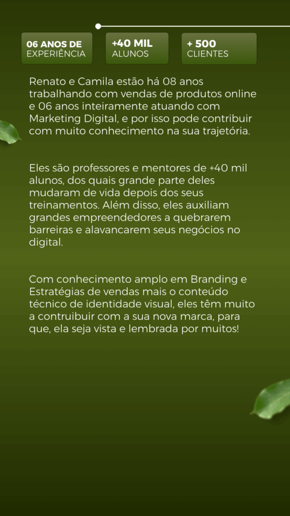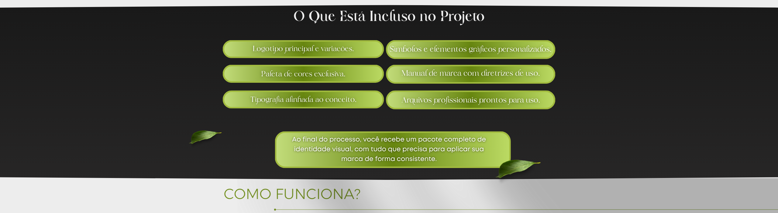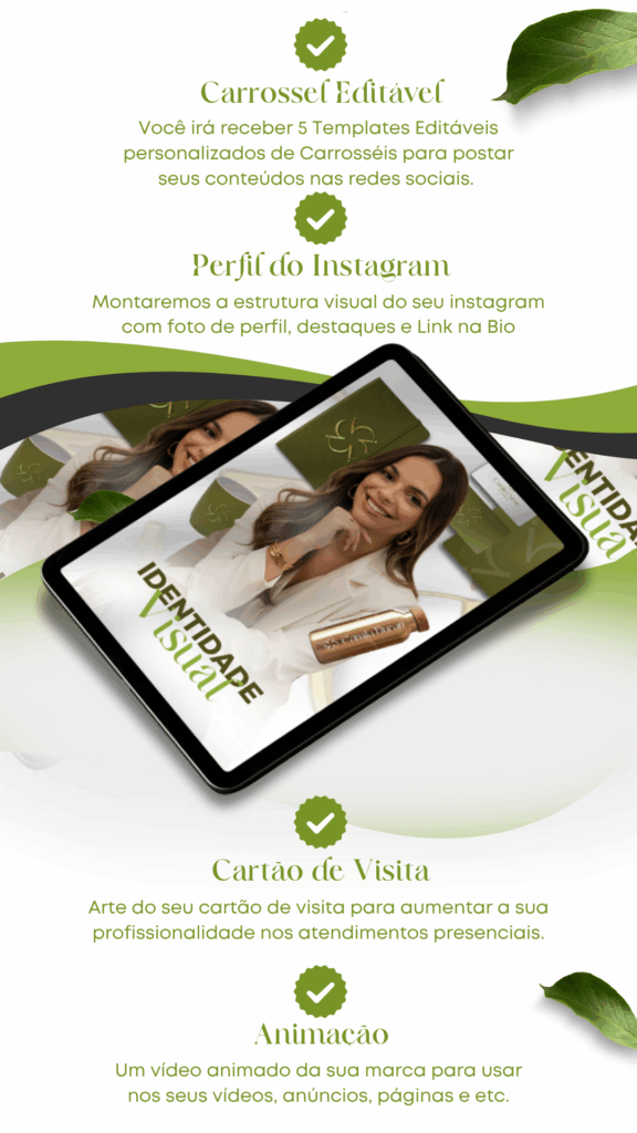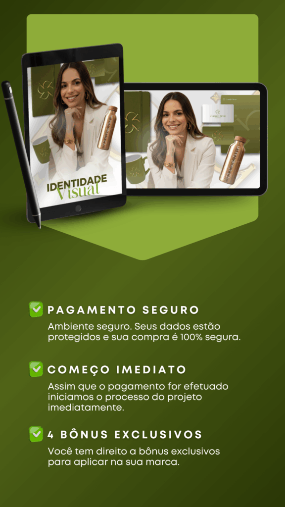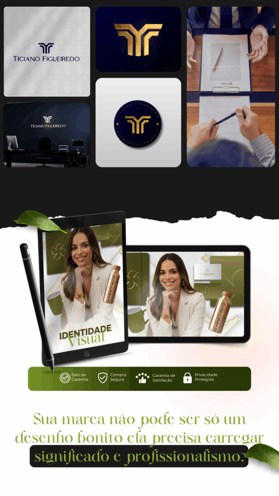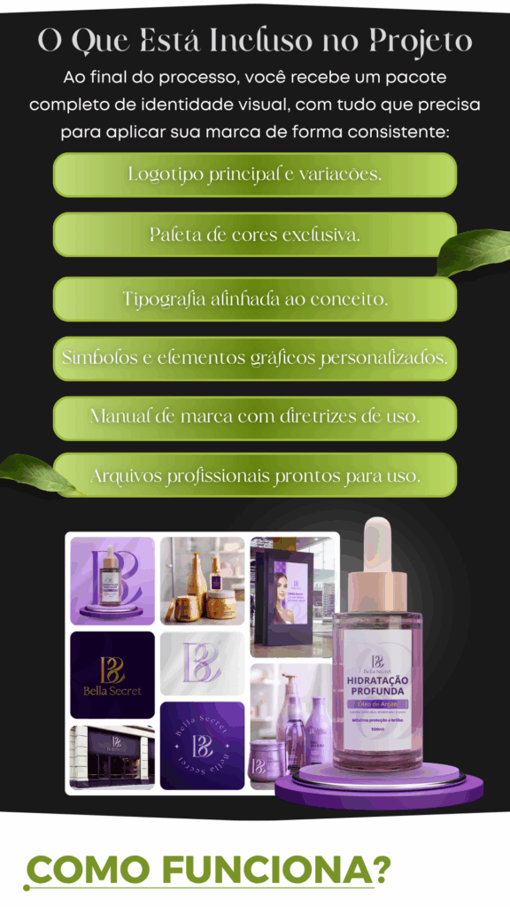 Você recebe o logotipo principal e suas variações, paleta de cores, tipografia, símbolos e elementos gráficos personalizados, além do manual de marca com diretrizes de uso e todos os arquivos prontos para aplicação.